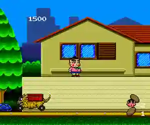 Experience rich 16-bit graphics with a distinct and goofy character design, featuring colorful sprites and humorous animations that bring its absurd story to life.
