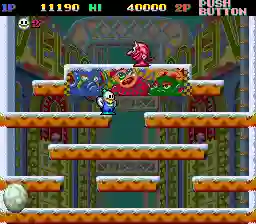 Assume the role of Nick or Tom to banish King Scorch's monsters within every room before the timer expires; you only get a single life per credit and continue from checkpoints when it ends. Masterfully aim snow to trap ghosts or turn enemies into a massive rolling snowball that eliminates all the minions it hits against any wall, then seize unique bonuses from special pots if you succeed quickly enough.